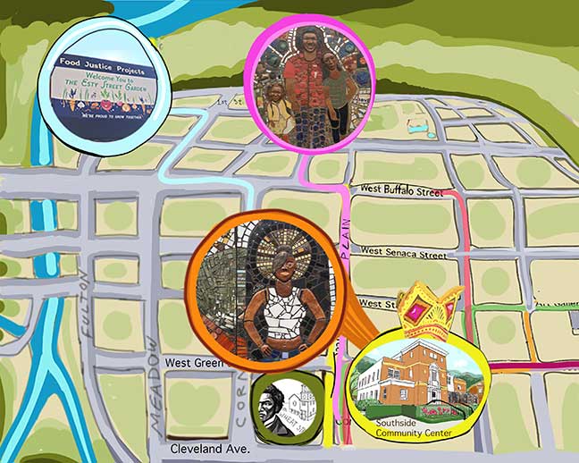 I started working with Black Girl Alchemy, in 2018, and later with the Community Unity Music Education Program, both of which call Ithaca’s Southside Community Center home. Working with CUMEP led to the honor of being selected as one of 8 local artists for Creatives Rebuild New York’s Artist Employment Program, a 2 year collaboration that, for me, included theatrical set design and children’s book illustration.