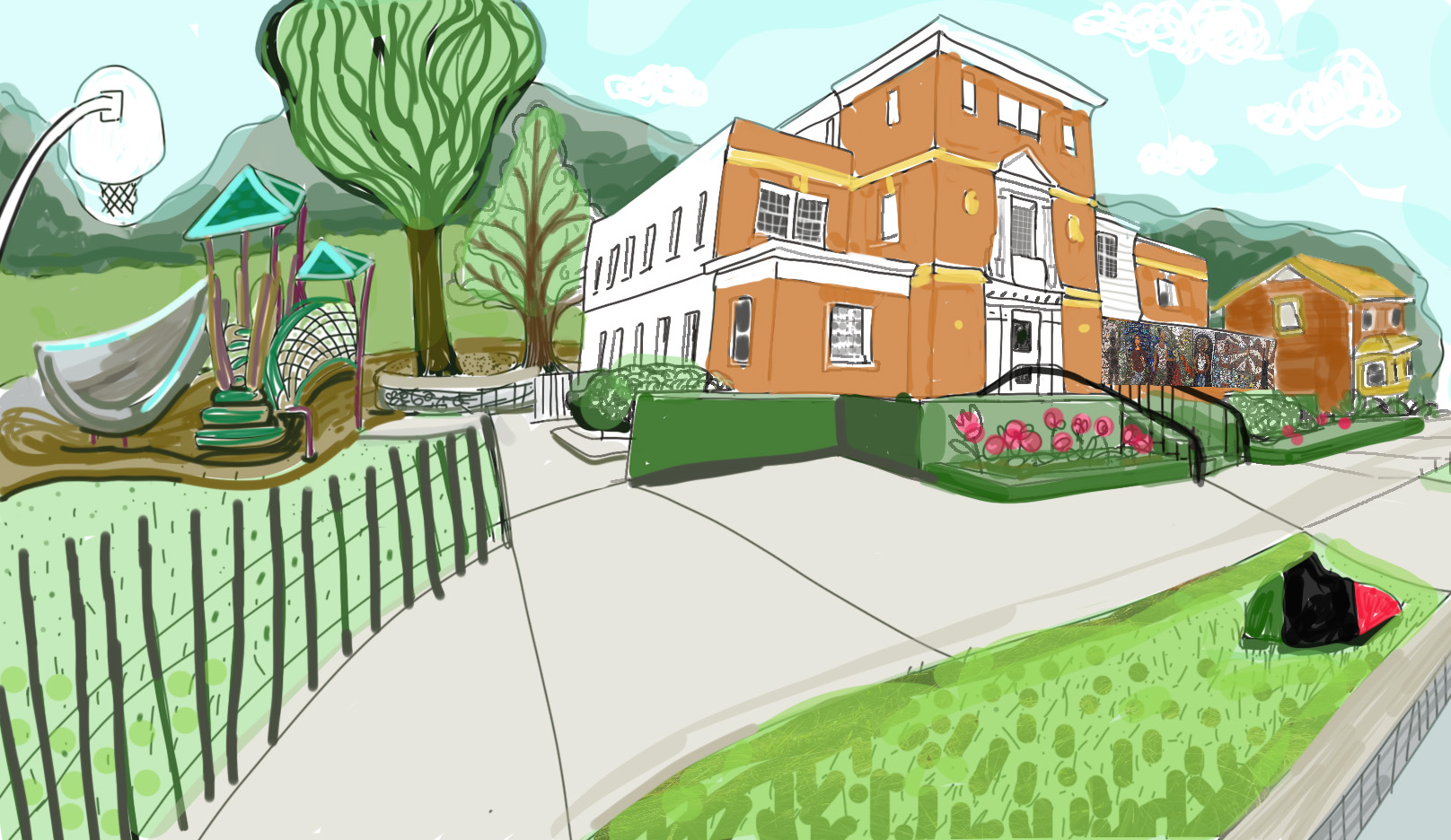 I worked with play space designer Rusty Keeler on projects nationally and internationally, often adding painted mural or mosaic elements, and facilitating volunteer engagement. We collaborated with communities creating outdoor learning and play spaces from Muskogee, Oklahoma to Bellingham, Washington, and in China, Scotland, and New Zealand.